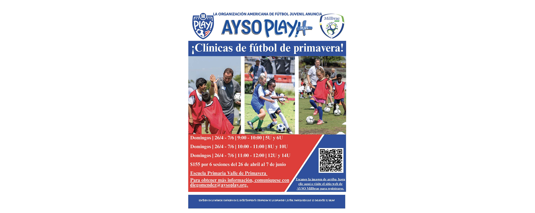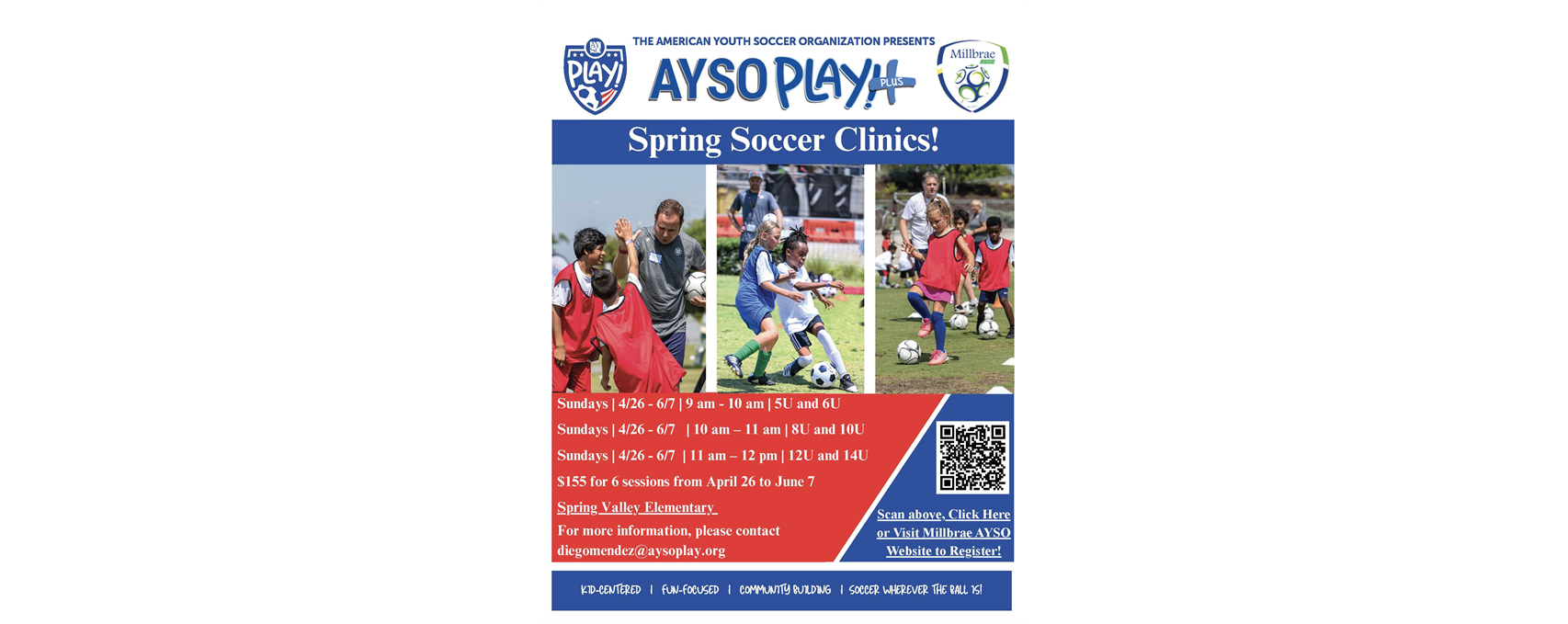 AYSO Play! Sessions start Sunday 3/1: go to Millbrae AYSO account to register for 1 hour session for 6 weeks!